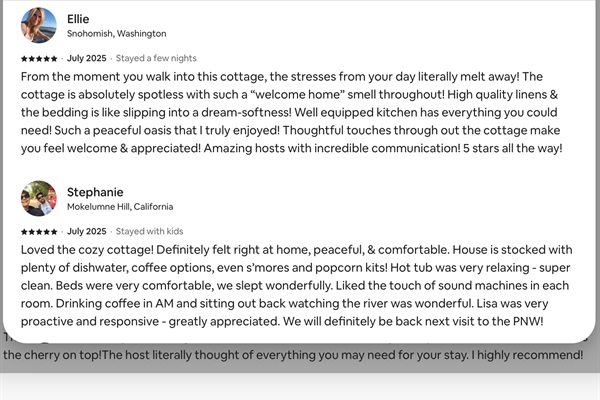 “It was a wonderful place to stay it felt like we were in a cottage in the woods but we were in a nice clean neighborhood 10 minutes from everything we needed.” - Giena @Puyallup River, WA Downtown Puyallup
